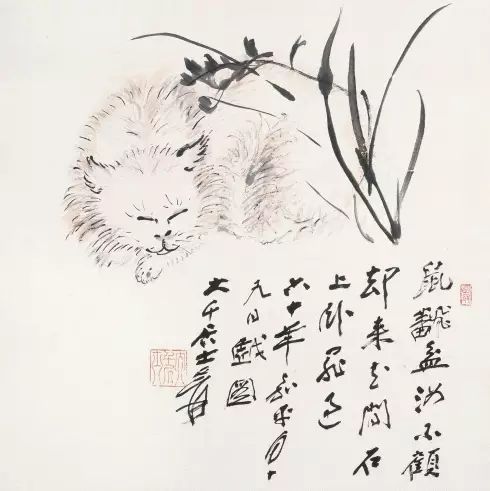款识:雪色波斯值万钱,金银嵌眼故应然。不捕黠鼠还同器,饱食朝昏祗欲眠。花底拳身不受呵,嫌寒就暖坐怀多。纵然博得儿童喜,奈此跳梁日甚何。往在故都畜一金银眼波斯玉猫,为悲鸿索去数月。悲鸿以书抵予曰:“此猫驯扰可喜,但不捕鼠,且与同器而食,为可怪耳,噫以之视,今又何怪耶?” 六十一年岁在壬子,苇窗属为大人杂志画鼠作封面。予向不工此,故今年春帖子只借八大山人画用之。乃作睡猫图以报之,并赋二诗。龚定厂句云:“略工感慨既名家”,窃用自笑也。大千居士爰,可以居寄。钤印:张爰之印、春长好、大千居士、大千世界、得心应手、大风堂