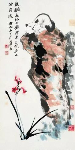 此幅小猫全用线条勾勒而成,寥寥数笔,再施以淡朱膘色、虚实关系表现得炉火纯青;而造型亦十分精确,显然是有大量观察猫生活的经验,将其习性情态了解入微,所以在画面中将小猫慵懒睡态也变现得惟妙惟肖,传神之至。而兰草也仅用几笔而成。线条飘举若少女舞袖,潇洒淋漓,妖娆妩媚,枝头盛开的两朵萱花并发幽香。整幅画面十分娴静,淡雅之极,使观者心宁。