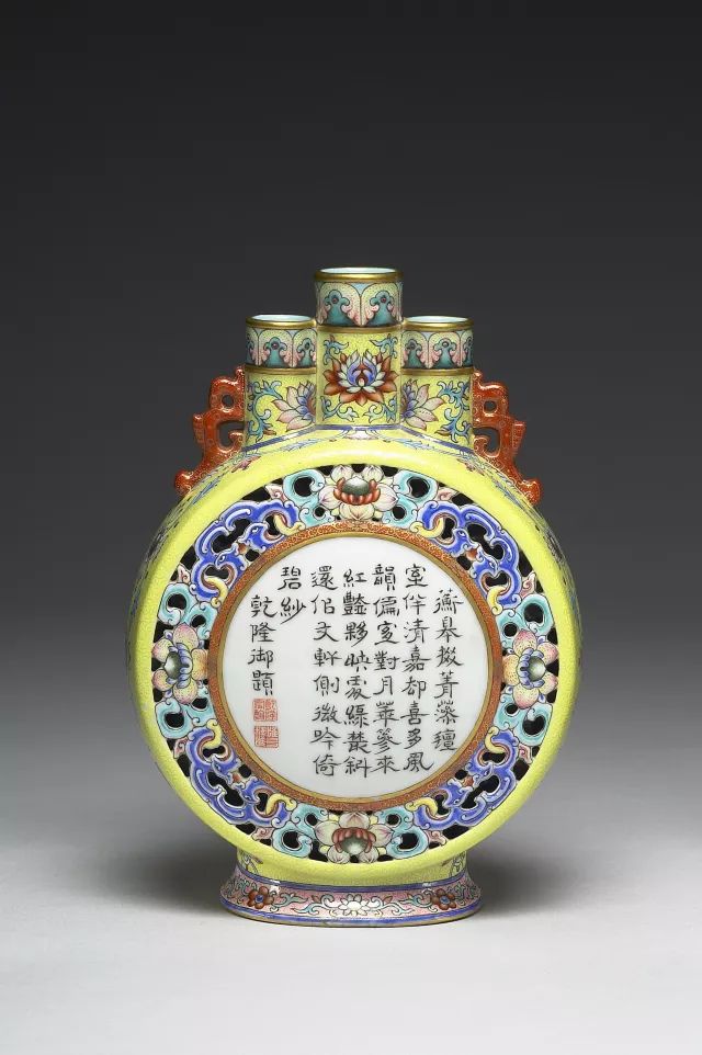 清宫珐琅彩瓷分两类: 一是磁胎画珐琅,即一般所称珐琅彩; 一是磁胎洋彩,两者均受清高宗宝爱,也十分相似。 洋彩的烧制与清高宗的品味喜好有关,更是当时内务府员外郎管理九江关务兼督陶官唐英(1682-1756)的杰出成就。在清高宗的鞭策之下,督陶官唐英每年春秋两季,亲自前往江西景德镇监造御用瓷器,为了博得君心,他不断推陈布新研发新技法,绞尽脑汁设计新样式,烧制出一批被誉为“鬼斧神工”奇巧的镂空旋转器;他又开创“锦上添花”剔刻技法,将洋彩的华贵艳丽臻于极致。“洋彩”便是他创新运用的名词,从“洋彩”的“洋”字,便知和西洋有关,制作时部分纹饰采用了西洋绘画技法。 洋彩瓷锦上添花玲珑胆瓶 高38.5公分 口径9.5公分 底径13.5公分 清 乾隆八年(1743年) 洋彩器上充满了代表清高宗个人的印记,例如御制诗、“乾隆辰翰”、“惟精惟一”、“乾隆”等款印,充分说明清高宗对洋彩的重视,或可解读为清高宗认为洋彩足以代表乾隆盛世创新工艺。 磁胎洋彩三多诗意轿瓶 高17.8公分 口径2.4公分 清 乾隆八年(1743年) 洋彩与珐琅彩 雍正十三年(1735)唐英所撰之《陶务叙略碑记》,文中对洋彩做了解释: 洋彩器皿,本朝新仿西洋珐琅画法,人物、山水、花卉、翎毛无不精细入神。 也就是说洋彩,在陶瓷分类上应属珐琅彩釉类,其绘画装饰摹仿自西洋。因此《活计档》将磁胎洋彩归入“乾清宫珐琅器皿”,《陈设档》则将磁胎洋彩与磁胎画珐琅同时归入“乾隆款磁胎”项下,说明两者关系。乾隆八年(1743),唐英又在另一部与景德镇御窑厂陶瓷制作相关的著作《陶冶图册》第十七编〈圆琢洋采〉中有更详细的说明: 圆琢白器,五采绘画,摹仿西洋,故曰洋采。需选素习绘事高手,将各种颜料研细调和,以白瓷片画染烧试,必谙熟颜料、火候之性,始可由粗及细,熟中生巧,总以眼明心细,手准为佳。所用颜料与法琅色同,其调色之法有三:一用芸香油;一用胶水;一用清水。盖油色便于渲染;胶水所调便于搨抹;而清水之色则便于堆填也。[1] 唐英明白指出:洋彩所用颜料与珐琅相同,难怪一般人很难分辨,同时唐英强调洋彩是“五彩绘画,摹仿西洋”[2],故应就绘画纹饰上寻得其与磁胎画珐琅的差异。 (一)“磁胎画珐琅”多以传统宫廷绘画方式与纹饰为主,少用西洋绘法或纹饰;“磁胎洋彩”则相反,多数参以西洋绘画画法及边饰为主,但少数仍采用传统宫廷绘画如山水、折枝四季花卉等。 (二)根据《活计档》记载,洋彩制作多完成于唐英督导的景德镇御窑厂,而磁胎画珐琅最后竣工地点则为宫中“珐琅作”御器作坊。 (三)二者成对纹饰的绘画风格不同。成对洋彩器与一般成对者一样,纹饰大多相同;画珐琅则略不同或完全不同。 (四)二者纹饰内所用诗文、章印不同;制作完成地点不同,落款方式亦有所不相同,这是辨识重点之一。 磁胎洋彩西洋人物山水火鐮盒 高6.6公分 长7.5公分 宽3.2公分 清 乾隆 洋彩黄锦地乾坤交泰转旋瓶 高19.6公分 口径6.4公分 底径6.8公分 清 乾隆九年(1744年) 洋彩冬景山水梅瓶 高19.8公分 底径5公分 口径3.6公分 清 乾隆七年 (1742年) 乾隆早期,唐英延续雍正晚期的洋彩创制,使用珐琅彩料,运用西洋画法,制作了华丽多彩的“磁胎洋彩”,其中尤以乾隆六年至九年之间,是乾隆洋彩烧制最兴盛也最精致的时期。乾隆八年,清高宗曾命唐英将景德镇御窑厂官窑制作过程,以图文并茂方式加以记载,撰成《陶冶图册》一书,也说明了景德镇御窑厂就是洋彩的制作与完工地点。[3] 西洋元素的应用与融合 关于唐英所说的“洋彩绘画,摹仿西洋,故曰洋彩”,“摹仿西洋”究竟是何样式?而洋彩洋花的样式为何?笔者以为符合唐英说法要件有五: (一)装饰图案中大量使用了西洋明暗光点绘法,主要以珐琅白料点饰光点,呈现圆状物体,无论主纹或边饰,均见此一特征。 (二)图案式的花卉叶纹上大多数渲染白料方式,或表现枝叶的光影明暗,此一画法几乎不见于磁胎画珐琅的绿叶表现上。[4] (三)采用西洋明暗阴影透视法,描绘人物画尤为明显。 (四)有些纹饰内,大量应用了西洋花草藤蔓纹饰设计构图。 (五)西洋花卉的使用,如洋菊与洋莲等洋花的装饰。 其中尤以图案花纹的细部,多模仿西洋光影画法,使用珐琅白料点饰光点,令花纹或物体更富立体感,虽然这些图案纹或花卉纹并不一定是作品主题,然而却充斥在构图设计中,与主题绵密结合。而且几乎所有锦上添花或繁花密布的洋彩器上皆见此一绘画方式,这种绘法极少见于磁胎画珐琅及其他彩瓷上,因此笔者认为这些以珐琅白料点染光点或枝叶上以白料染边光影描绘法,实则西洋光影明暗透视法,亦与西洋绘画上描画静物表现的光影手法如出一辙。 洋彩洋红地开光四季山水碗 高5.4公分 口径13.7公分 底径5.2公分 清 乾隆 洋彩洋红地花卉三多小碗 高5公分 口径11.9公分 底径4.1公分 清 乾隆 因此,这些类似西洋绘画的表现方式,应可视为唐英所称的“摹仿西洋”。而且洋彩上常见的西洋花草藤蔓纹饰,也是与西洋相关主要特征之一,看似很中国的山水绘画或开光花卉,却也包藏着无数的西洋画意,这些纹样无论是直来接自西洋器物的金属镶边[5],或间接受到西洋纹饰的启迪,都见证了东西文化艺术的交流,让人能充分理解到唐英所谓“西洋珐琅画法”与“摹仿西洋”。 磁胎画珐琅八哥胆瓶 高20.4公分 口径3.7公分 清 乾隆六年(1741 年) 磁