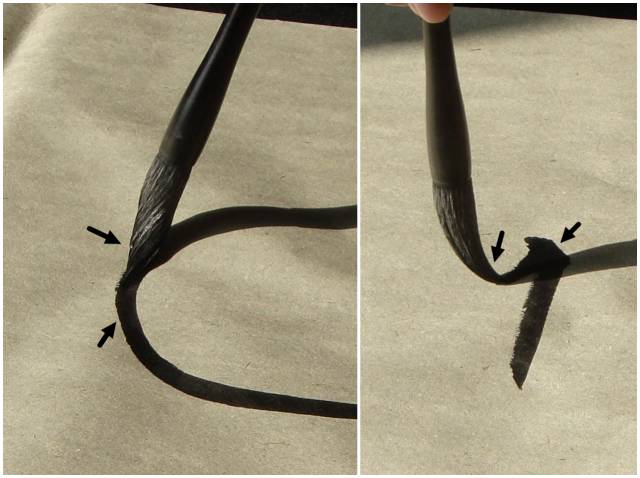 “一搨直下”在行笔中,因为起笔储足了快速行笔的笔势,所以行笔直接,“一搨直下”就是这种行笔的形象叫法,所以也有些叫“一搨直过”。“一搨直下”笔锋在行笔过程呈平行状,所以枯笔会出现平行的飞白形态。(图10)、(图12)