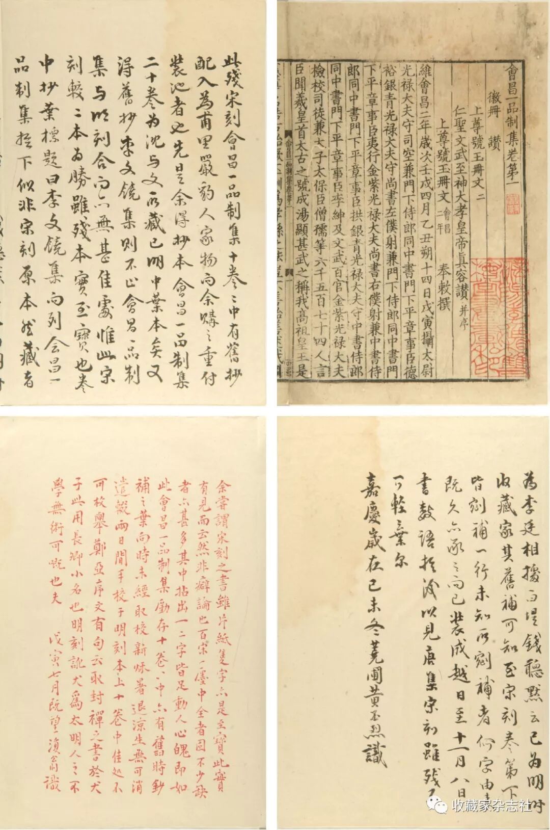 黄氏藏书有南宋中期刻本《会昌一品制集二十卷》残本二册,存十卷(一至十)。此书为唐代武宗朝名相李德裕文集,由宋代郑亚编订,多为制诰之作。顾广圻为黄氏藏书楼作《百宋一廛赋》,其中有“敬舆中书,文饶一品”,“敬舆中书” 指陆贽集,“文饶”“即李德裕,“一品”说的就是《会昌一品制集》。黄丕烈对此句作注云:“残本《会昌一品集》,每半页十三行,每行廿二字,所存一至十凡十卷。此二种(另一种指陆贽集),予悉尝用以手勘他本,语云:‘不敢因缺损已甚而忽之,岂特佞宋,亦以重二公也。’今为赋所取。”可见黄丕烈重视此书,还有看重李德裕道德、人品、事功的因素。可能因为是残本,黄氏编著《百宋一廛书录》时虽以收藏此书,但未予著录。后来潘祖荫、缪荃孙等编黄氏藏书题跋时,也都没有收录《会昌一品制集》,后出各种黄跋辑佚也未涉及。直到此书入藏上海图书馆,得到冀淑英等人关注,才得以重新披露。黄氏题跋有两则,其一是嘉庆四年(1799)在第二册卷六首扉叶上跋语:“此残宋刻《会昌一品制集》十卷。卷中有旧抄配入,为甫里严豹人家物,而余购之,重付装池者也。先是,余得抄本《会昌一品制集》二十卷,为沈与文所藏,已明中叶本矣。又得旧抄《李文饶集》,则不止《会昌一品制集》与明刻合,而亦无甚佳处。惟此宋刻较二本为胜,虽残本,实至宝也。卷中抄叶标题曰‘李文饶集’’而列‘会昌一品制集’于下,似非宋刻原本。然藏者为李廷相,据白堤钱听默云,已为明时收藏家,其旧补可知。至宋刻卷第下皆剜补一行,未知所剜补者何字。由来既久,亦承之而已。装成越日至十一月八日,书数语于后,以见唐集宋刻,虽残不可轻弃尔。嘉庆岁在己未冬,荛圃黄丕烈识。”嘉庆二十三年(1818),在首次题跋19年后,黄氏又取出此书以校明刻本,在首册扉叶朱笔题跋:“余尝谓宋刻之书虽片纸只字,亦是至宝,此实有见而云然,非癖论也。百宋一廛中全者固不少,缺者亦甚多,其中拈出一二字,皆足动人心魄。即如此《会昌一品制集》,仅存十卷,卷中亦有旧时钞补之叶,向时未经取校。新秋暑退凉生,无可消遣,辍两日闲,手校于明刻本上。十卷中,佳处不可枚举。郑亚序文有句云‘取封禅之书于犬子’,此用长卿小名也,明刻讹‘犬’为‘太’,明人之不学无术,可慨也夫!戊寅七月既望,复翁识。”黄丕烈以“佞宋”著称,其看重宋本,主要还是因为重视宋本的文献价值。正如他在为宋本《韩非子》作跋时所称“书必以真本为上”,宋本在他眼里,多为“真本”,因此具有特殊的魅力。